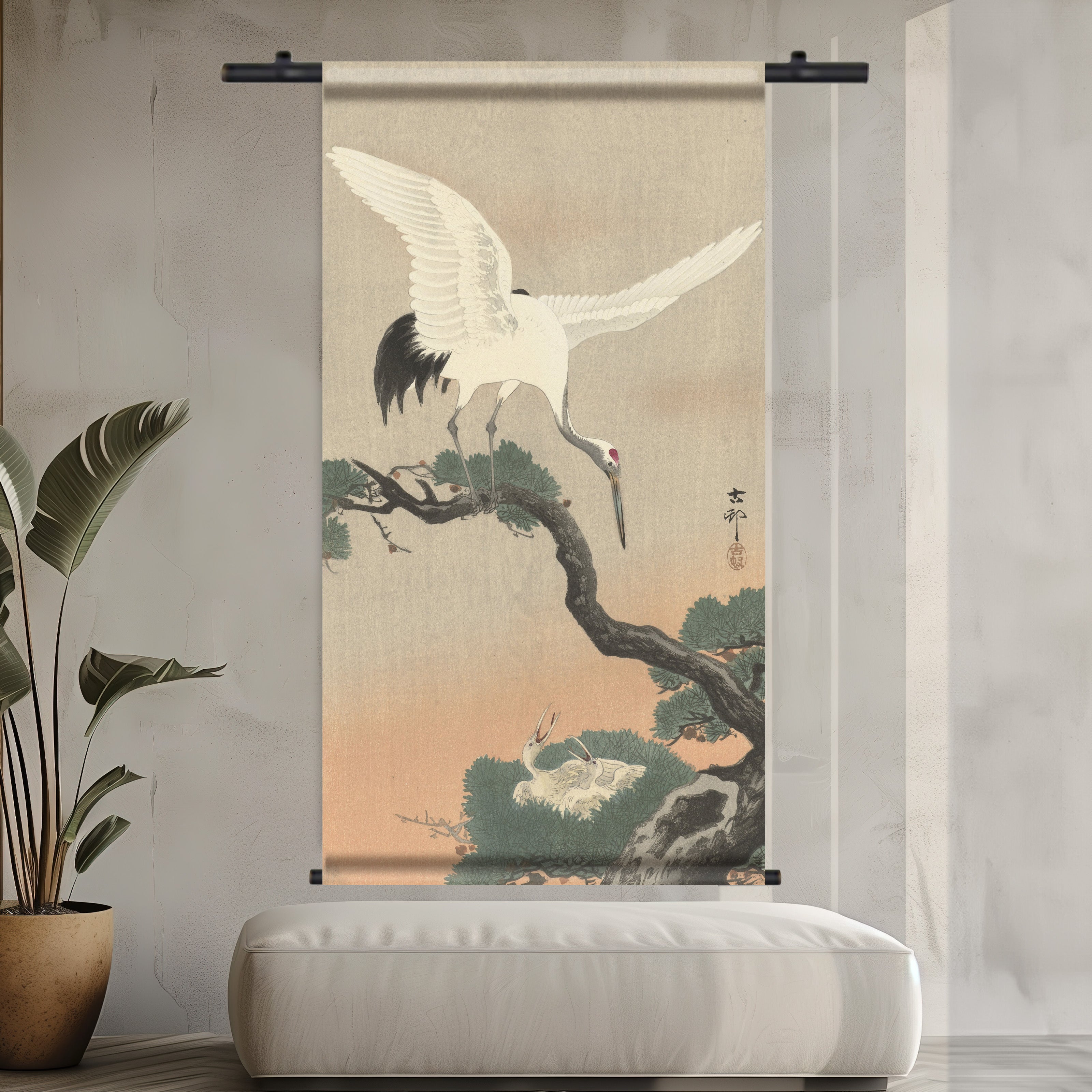 Wandkleed | Japanse kraanvogel op pijnboomtak